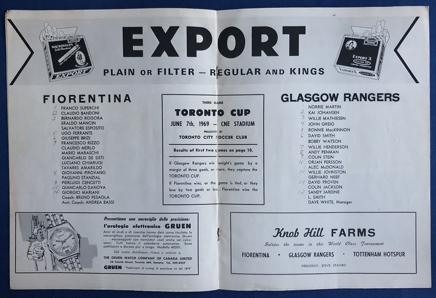 7th June 1969 – Rangers v Fiorentina Toronto Cup match played at the CNE Stadium in front of 25,000. Rangers lost the match 2-0.