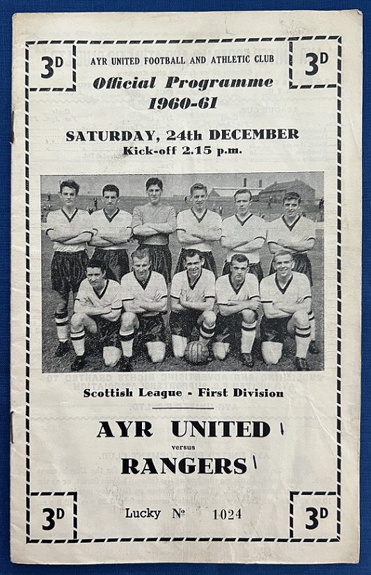 24th December 1960 – Ayr United v Rangers Scottish League match played at Somerset Park in front of a crowd of 15,500. Rangers lost the match 1-0.