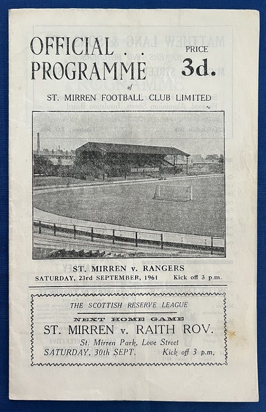 23rd September 1961 – St. Mirren v Rangers Scottish League match played at Love Street in front of a crowd of 34,000. The match ended in a 1-1 draw, with Scott scoring for Rangers.
