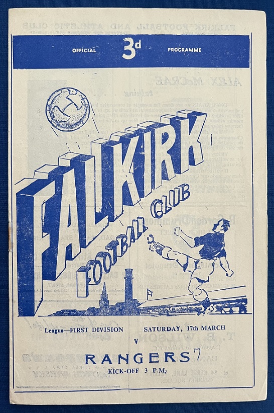 17th March 1962 – Falkirk v Rangers Scottish League match played at Brockville in front of a crowd of 18,000. Rangers won the match 7-0, with goals from Wilson (6) & Scott.