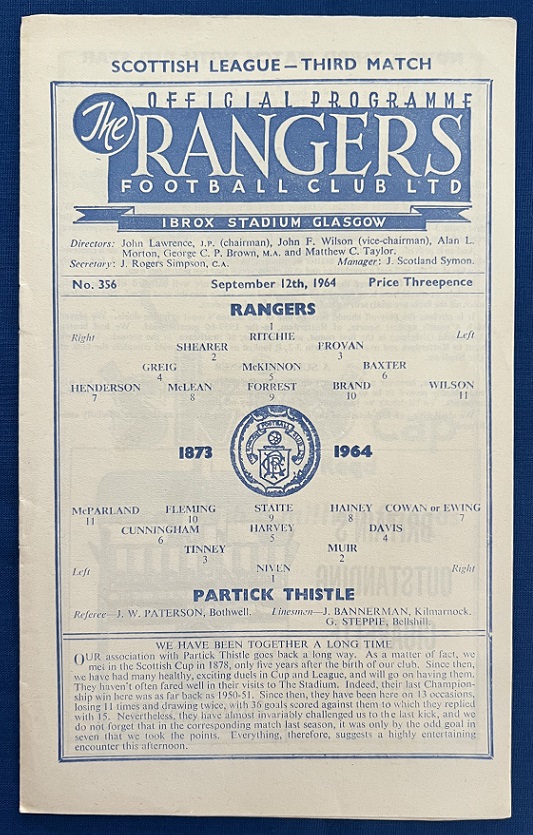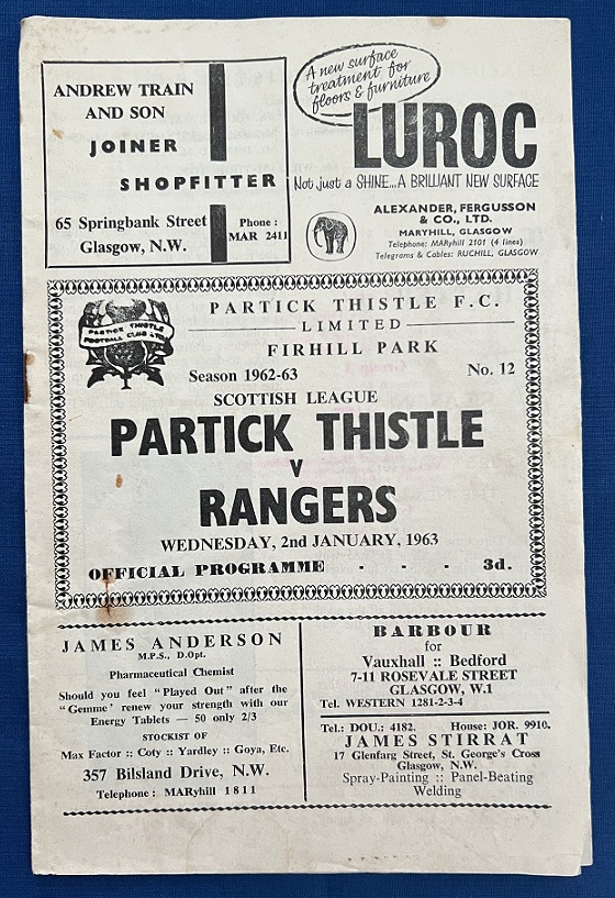 2nd January 1964 – Rangers v Partick Thistle Scottish League match played at Ibrox in front of a crowd of 30,000. Rangers won the match 4-3, with goals from Brand (2), Greig & Millar.