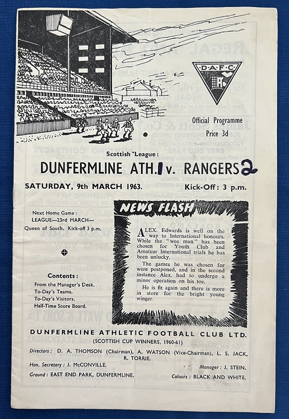 9th March 1963 – Dunfermline Athletic v Rangers Scottish League match played at East End Park in front of a crowd of 22,500. Rangers won the match 2-1, with goals from Wilson & Millar.