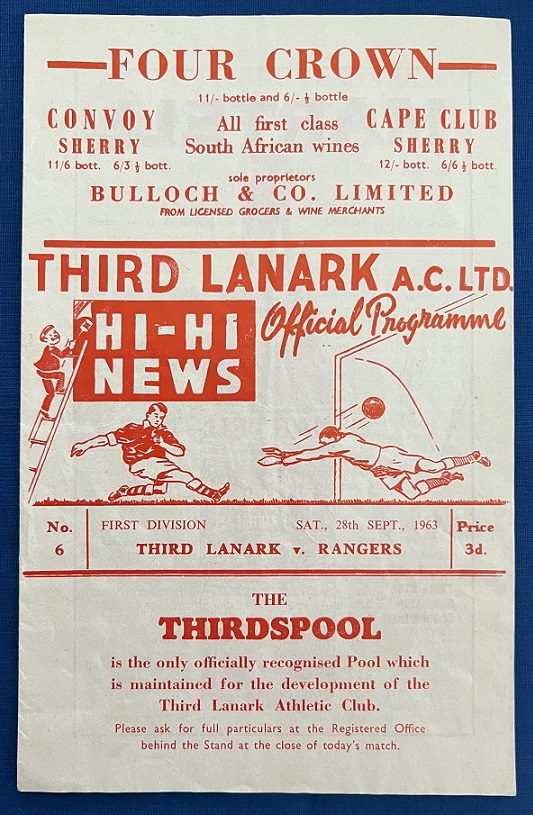 28th September 1963 – Third Lanark v Rangers Scottish League match played at Cathkin Park in front of 25,000. Rangers won the match 5-0, with goals from Forrest (4) & Baxter.