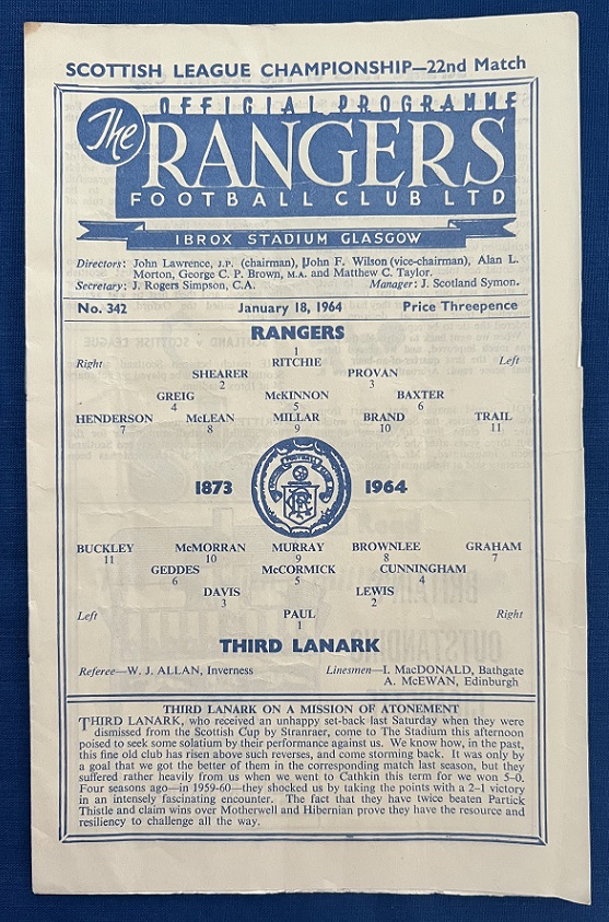 18th January 1964 – Rangers v Third Lanark Scottish League match played at Ibrox in front of a crowd of 17,000. Rangers won the match 2-0, with Brand scoring both goals.