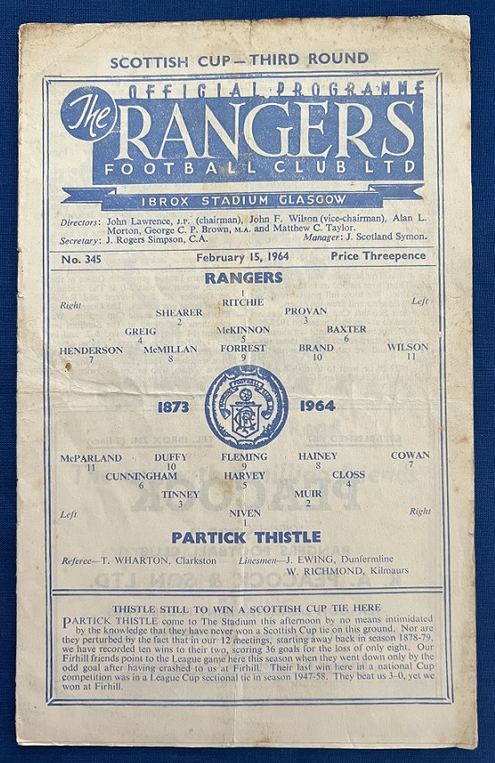 15th February 1964 – Rangers v Partick Thistle Scottish Cup tie played at Ibrox in front of 62,000. Rangers won 3-0, with goals from Wilson (2) & Forrest.