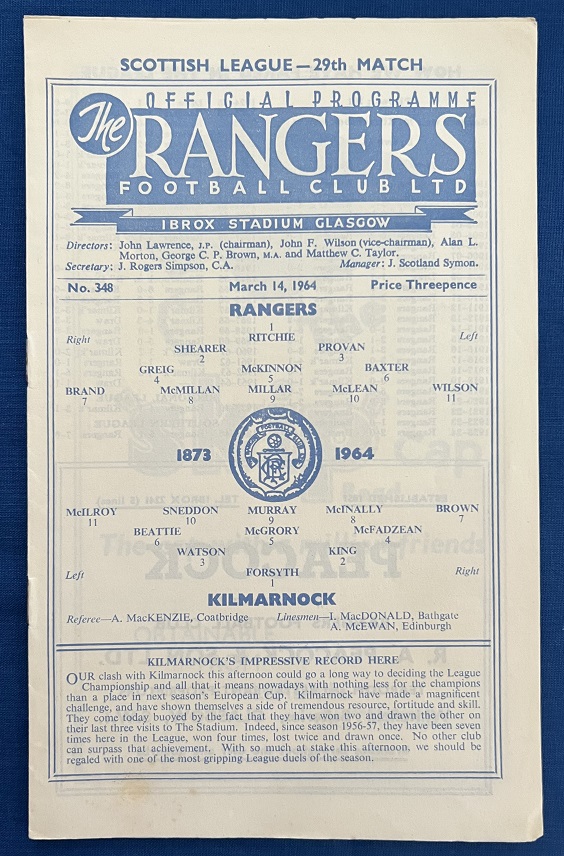 14th March 1964 – Rangers v Kilmarnock Scottish League match played at Ibrox in front of a crowd of 45,870. Rangers won the match 2-0, with goals from McLean & Wilson.