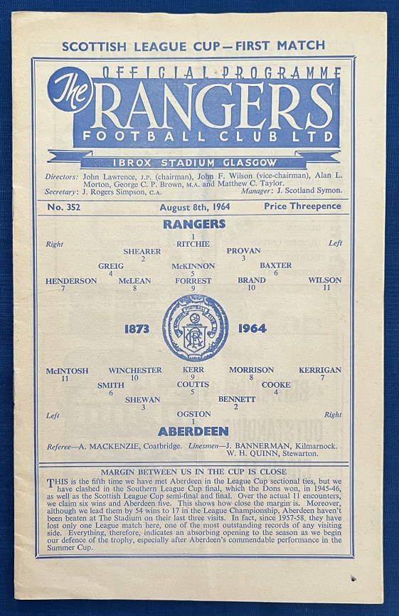 8th August 1964 – Rangers v Aberdeen Scottish League Cup tie played at Ibrox in front of a crowd of 45,000. Rangers won the match 4-0, with goals from McLean (2), Forrest & Wilson.