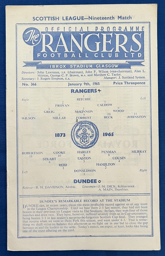 31st December 1966 – Rangers v Dundee Scottish League match played at Ibrox in front of a crowd of 25,000. The match ended in a 2-2 draw, with Rangers goals scored by McKinnon & A. Smith.