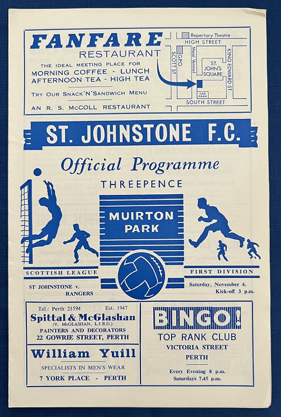 4th November 1967 – St. Johnstone v Rangers Scottish League match played at Muirton Park in front of a crowd of 20,000. Rangers won the match 3-2 with Johnston, Ferguson & Persson scoring for Rangers.