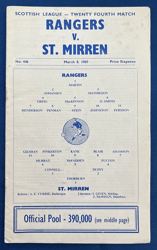 8th March 1969 – Rangers v St. Mirren Scottish League match played at Ibrox in front of 40,000. Rangers won the match 6-0 with Johansen, D. Smith, Greig, Ferguson, Persson & Penman scoring.