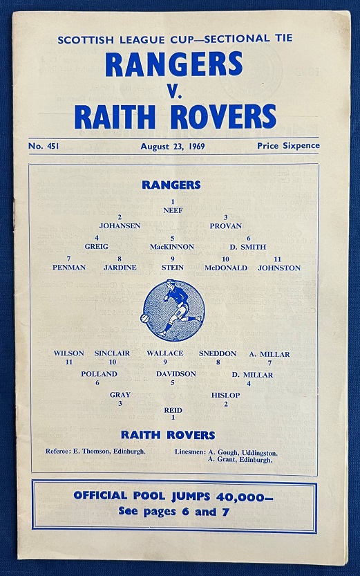 23rd August 1969 – Rangers v Raith Rovers Scottish League Cup match played at Ibrox in front of 40,000. The match ended in a 3-3 draw with Penman, A. MacDonald and a Polland own goal.