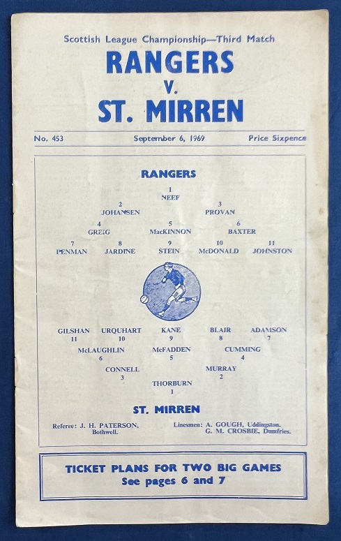 6th September 1969 – Rangers v St. Mirren Scottish League match played at Ibrox in front of a crowd of 41,000. Rangers won the match 2-0 with goals from Johnston & Provan.