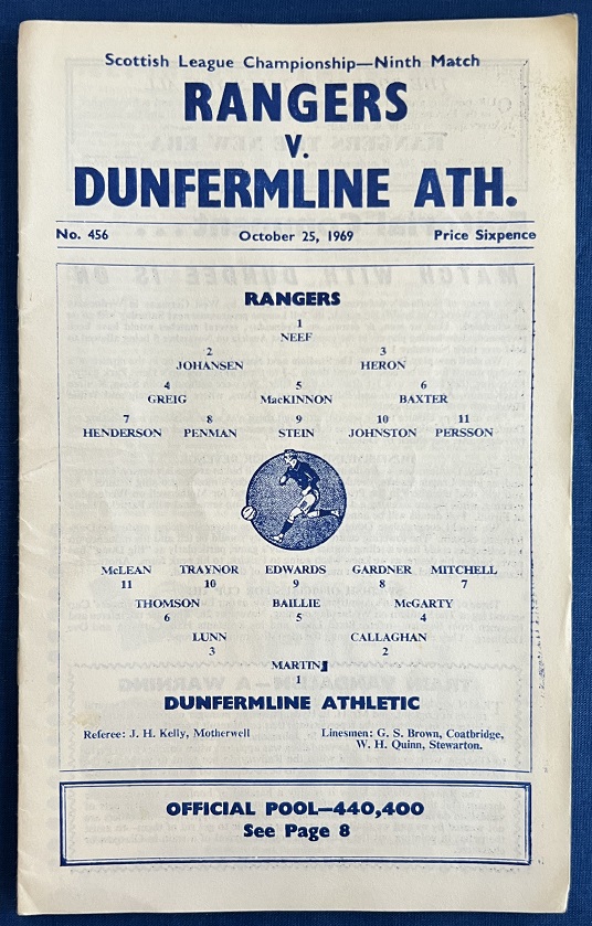 25th October 1969 – Rangers v Dunfermline Athletic Scottish League match played at Ibrox in front of 32,998. Rangers won 2-0 with Penman & Johansen scoring.