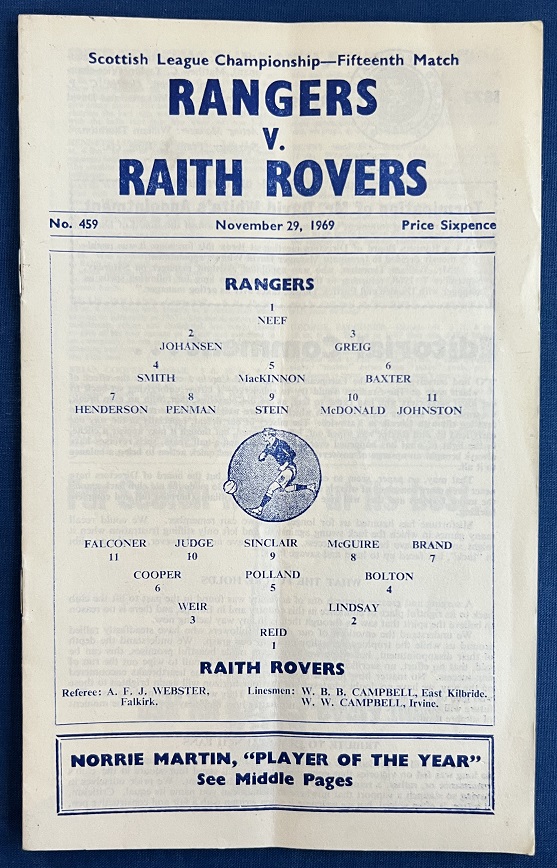 29th November 1969 – Rangers v Raith Rovers Scottish League match played at Ibrox in front of a crowd of 25,000. Rangers won the match 3-0 with goals from Johnston, Stein & A. MacDonald.