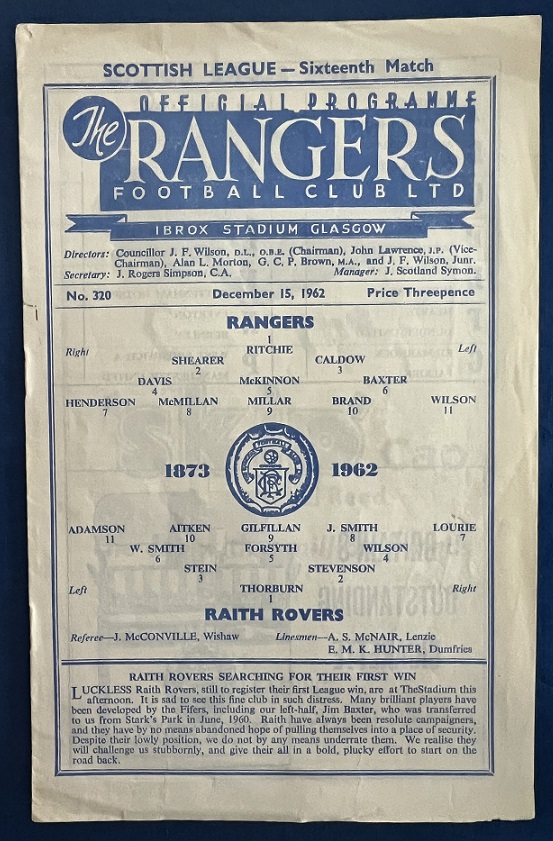 15th December 1962 – Rangers v Raith Rovers Scottish League match played at Ibrox in front of a crowd of 20,000. Rangers won the match 4-2, with goals from Brand (3) & Wilson.
