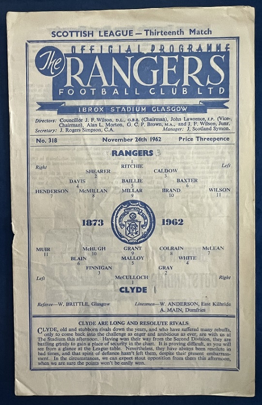 24th November 1962 – Rangers v Clyde Scottish League match played at Ibrox in front of 28,000. Rangers won the match 3-1, with goals from Brand (2), & Millar.