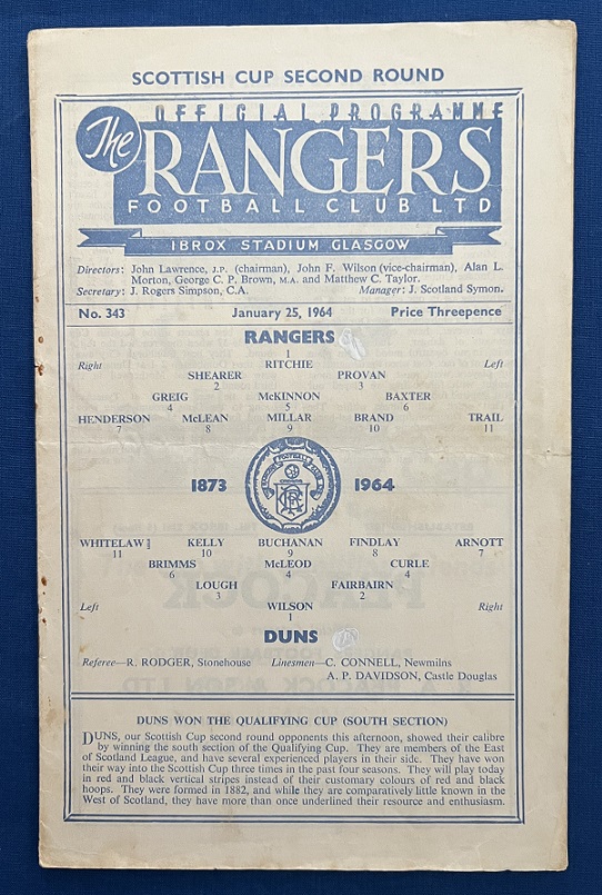 25th January 1964 – Rangers v Duns Scottish Cup tie played at Ibrox in front of a crowd of 17,350. Rangers won the match 9-0, with goals from Millar (4), Brand (3), McLean & Henderson.