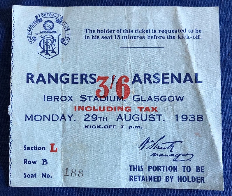 29th August 1938 – Rangers v Arsenal – Friendly.