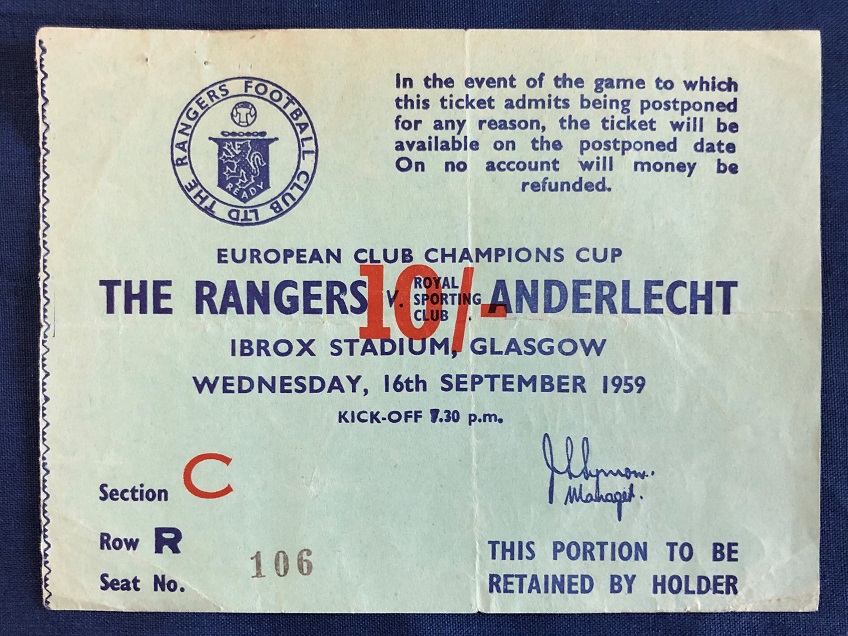 16th September 1959 – Rangers v Anderlecht – European Cup.