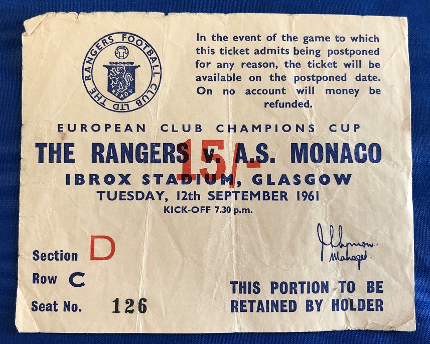 12th September 1961 – Rangers v A.S. Monaco – European Cup