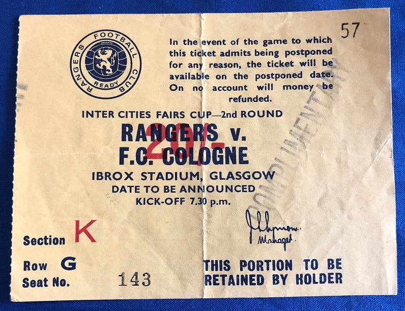 8th November 1967 – Rangers v F.C. Cologne – Inter Cities Fairs Cup