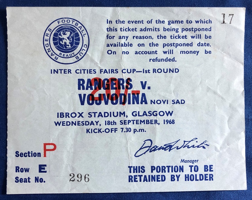 18th September 1968 – Rangers v Vojvodina – Inter Cities Fairs Cup
