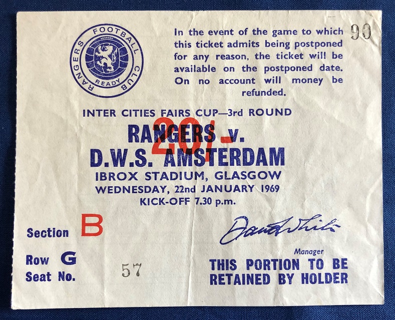 22nd January 1969 – Rangers v D.W.S. Amsterdam – Inter Cities Fairs Cup