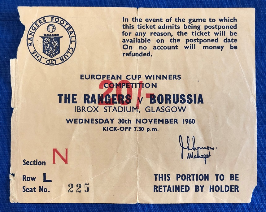 30th November 1960 – Rangers v Borussia Monchengladbach – European Cup Winners Cup