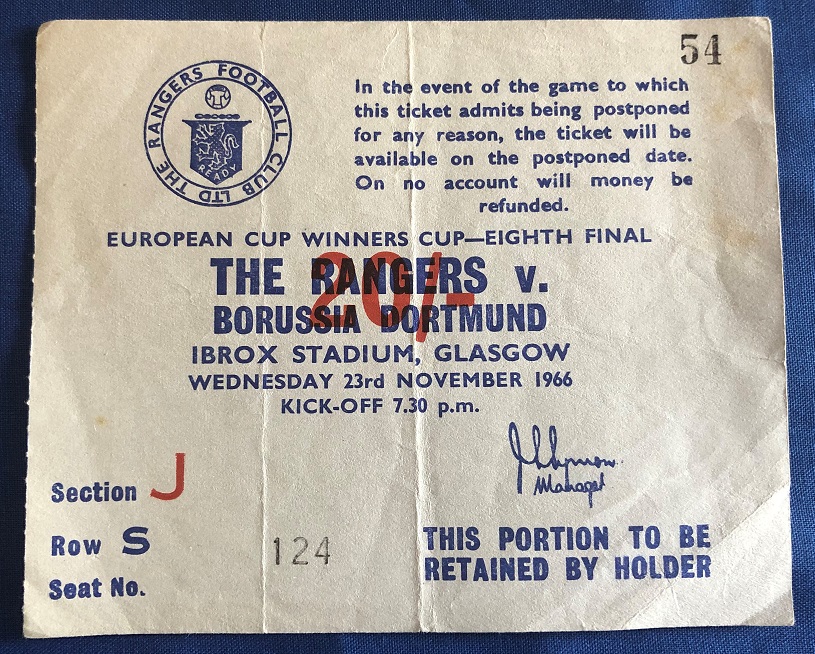 23rd November 1966 – Rangers v Borussia Dortmund – European Cup Winners Cup