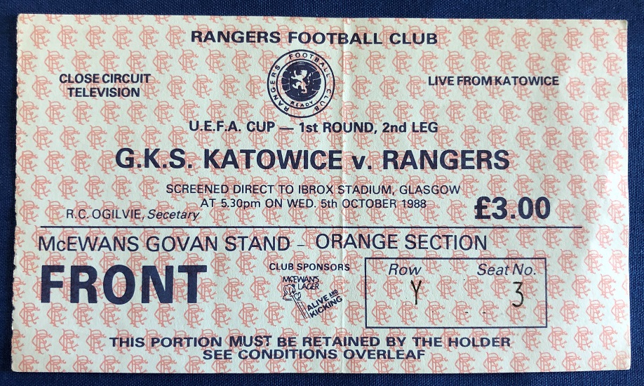 5th October 1988 – GKS Katowice v Rangers – UEFA Cup – Beam back ticket