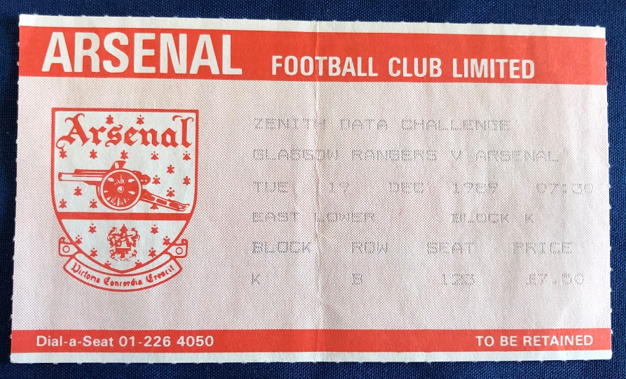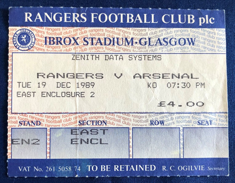 19th December 1989 – Rangers v Arsenal – Friendly – Beam back ticket