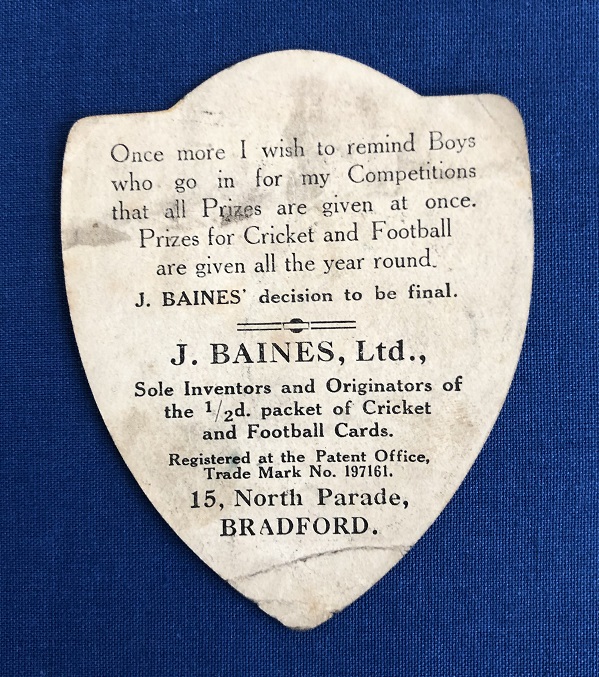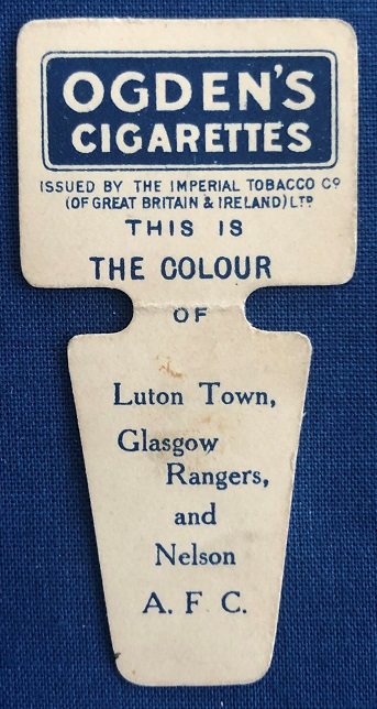 1910 – Ogden’s Ltd. Football Club Badges – Luton Town/Rangers/Nelson. Supporters were supposed to fold this card and put it in their button hole or cap/hat and wear it to the football match to show their allegiance to their club.