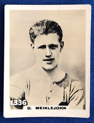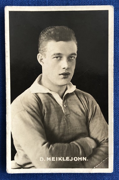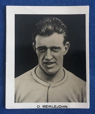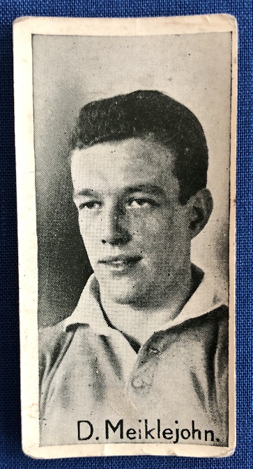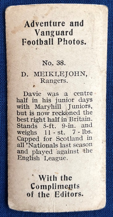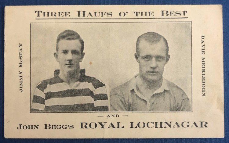 1929 – John Begg – Royal Lochnagar Whisky – Featuring Davie Meiklejohn on the front and list of Glasgow Cup Finals to date on the rear.