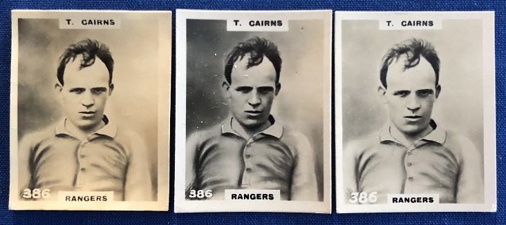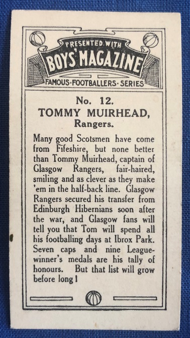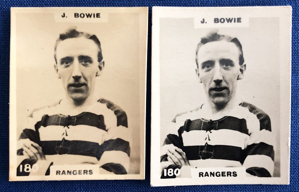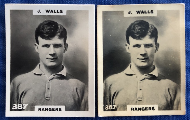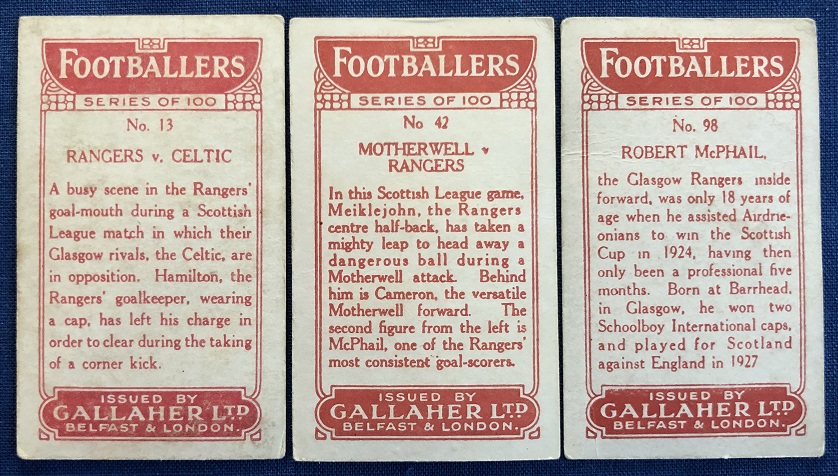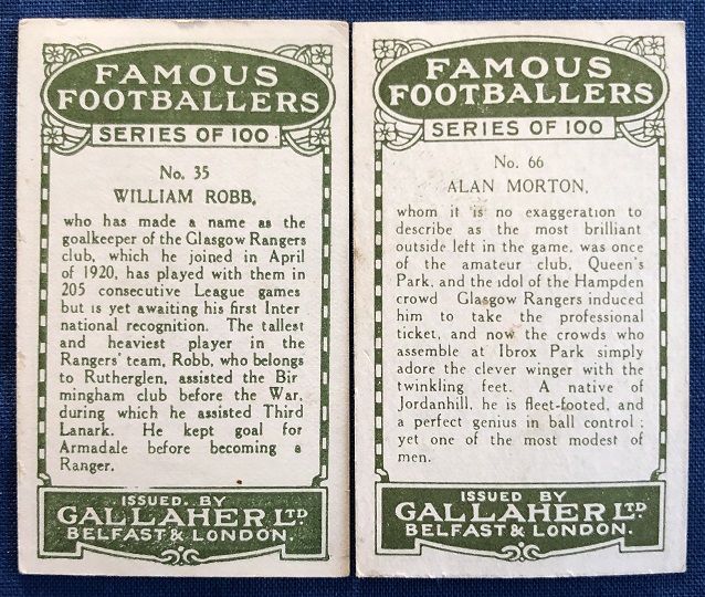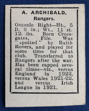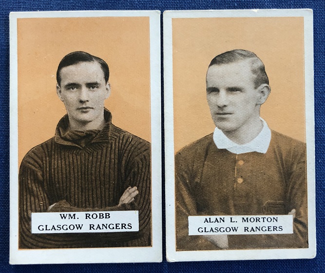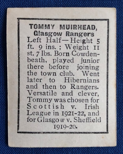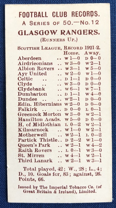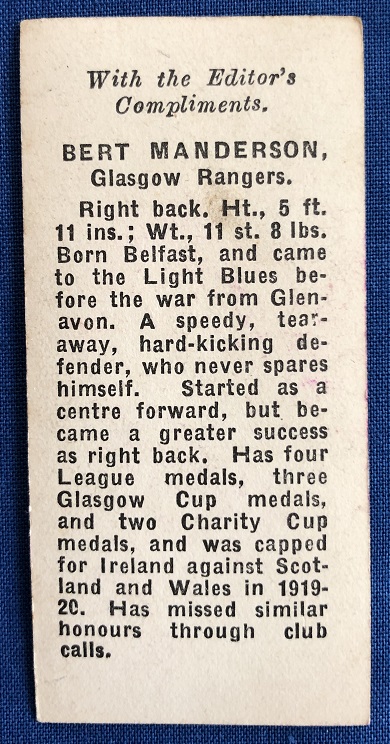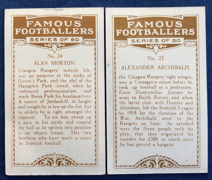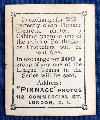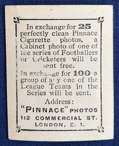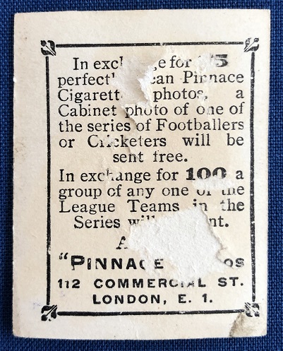 For ease of displaying the Rangers Pinnace cards, I have just listed them by order of their issue number and where there are different backs for the same player, I have listed in order of when such backs were issued. Like other issuers of early 20th century cards, many mistakes were made. Mistakes relating to Rangers cards are commented on as you go.