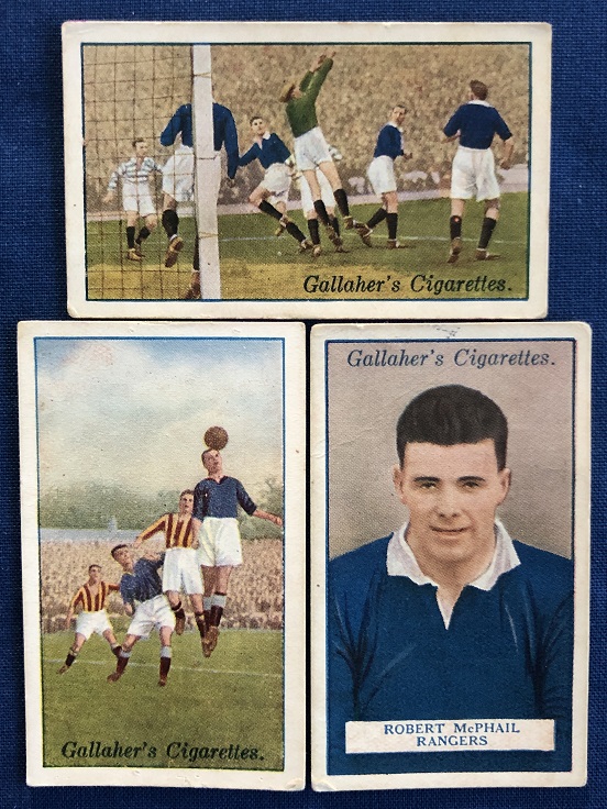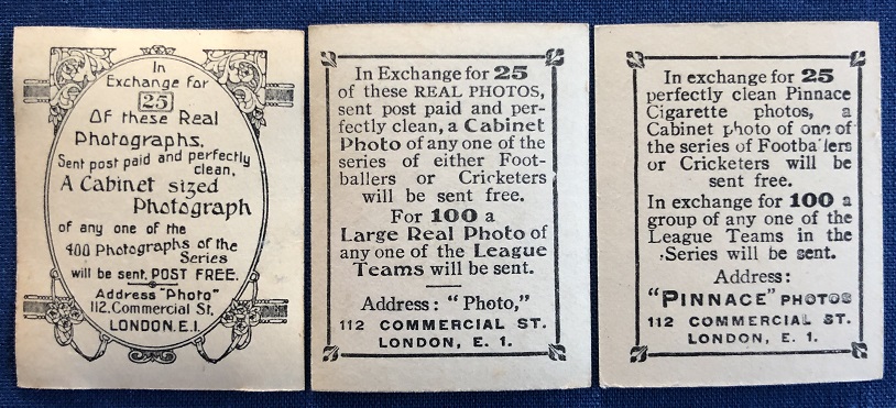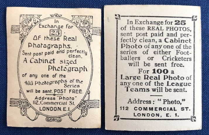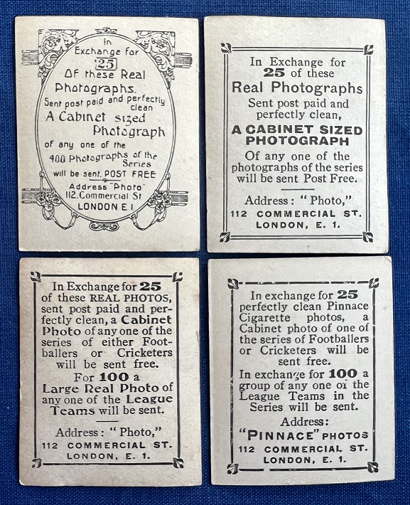 Early 1920’s – Godfrey Phillips Ltd. issued ‘Pinnace’ cards in 3 different sizes; ‘Miniature’ (4.5cm x 3.5cm), ‘Large’ (8.5cm x 6cm), and ‘Cabinet’ (15cm x 10cm), the idea being that collectors could upgrade to the larger sizes by redeeming a number of smaller sized cards. Some of the Rangers Miniature cards were issued with 4 different backs between 1920-21 and the Large cards were issued with 1 type of back. All Cabinet sized cards had plain backs.