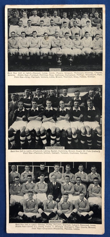 1938 – Amalgamated Press (The Champion) – Prominent Football Teams – “Rangers/Middlesbrough/Leicester” (uncut card).