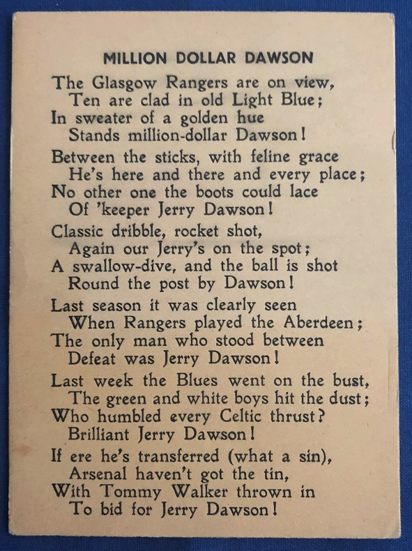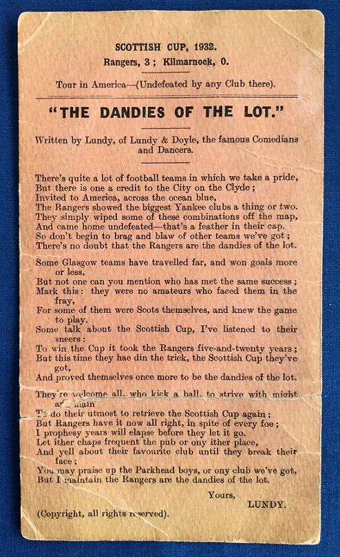 c. 1932 – Unknown publisher – Poem card written by Lundy of ‘Lundy & Doyle’ (famous Comedians & Dancers), mentioning the Rangers tours of North America & Canada in 1928 & 1930, and winning the Scottish Cup in 1932.